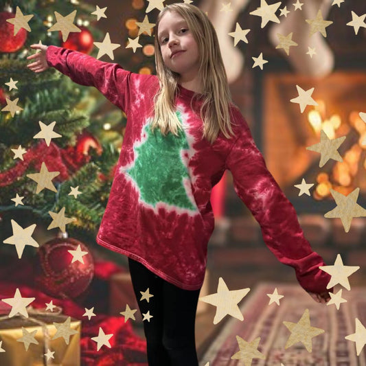 Green Tree on Red Long Sleeve Adult Tie Dye