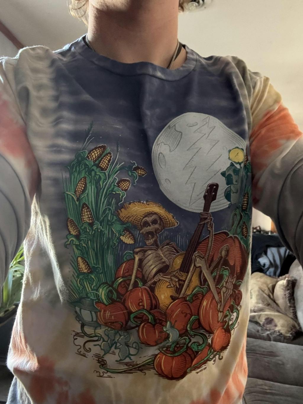 I wouldn't be caught dead (pun!) in tie-dye, even as a kid. Soooo, this off-white cotton long sleeved shirt with exact Workingman's cover is perfect! It's so soft, I've been sleeping in it, I ordered one size up; it's true to size. Generous fabric-- the sleeves can cover my hands, if I want. It's really sweet to have my beloved Ronnie K. so clear and crisp next to my heart! LOVE.