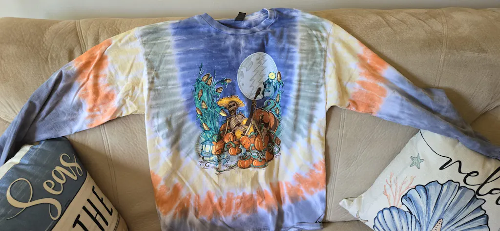 The Harvest Moon Long Sleeve Tie-Dye is back and better than ever—ready to keep you toasty through the fall season. With a skeleton jamming under a glowing full moon and surrounded by pumpkins, it’s got just the right touch of spooky, wrapped in warm autumn tie-dye swirls.